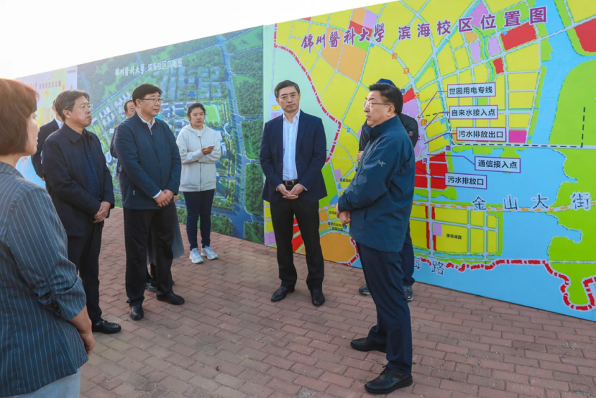 2023年10月7日,市委书记刘克武到锦州医科大学滨海新校区进行实地调研。锦州医科大学党委书记闻德亮,党委副书记、校长丁维光陪同调研并汇报新校园筹建情况。